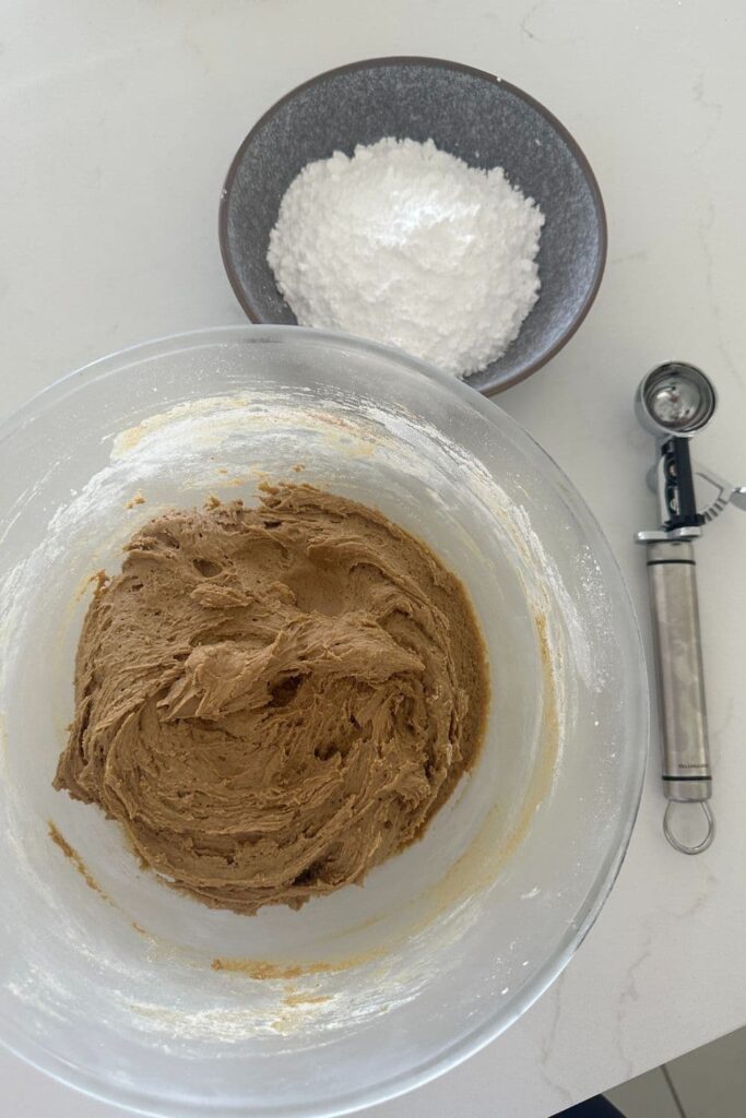 Using a cookie scoop, scoop large balls of dough and roll them into balls. Roll the balls into the powdered sugar until they are completely coated.