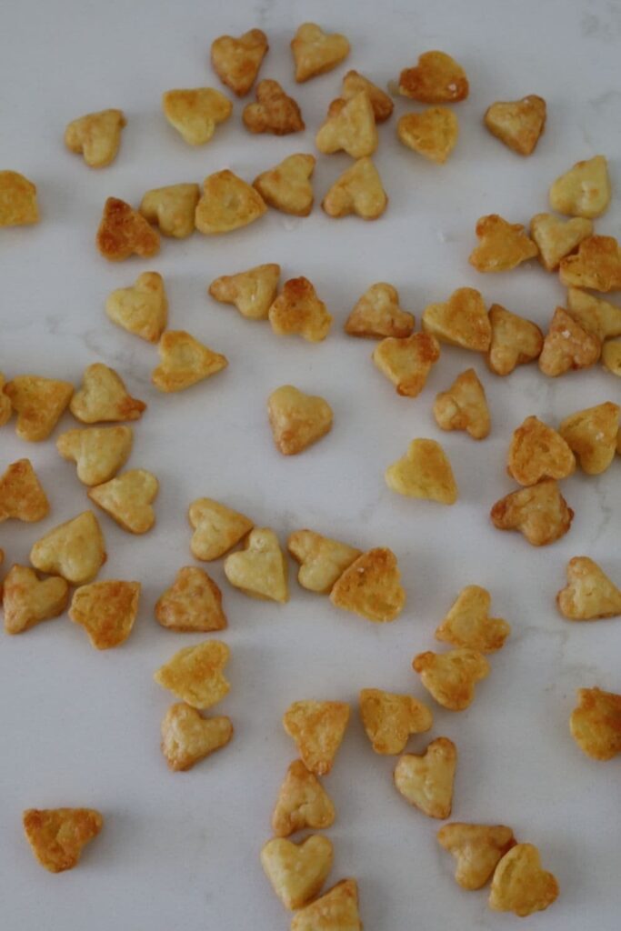 - Take a small cookie cutter (you can use this goldfish cutter or just use what you have). Cut out as many crackers as can from the dough and place them on the lined baking sheet.Repeat this process until you have no dough left.A little tip - I found this easiest to do with a small round cookie cutter. The heart cutter that I tested was time consuming as I had to use a skewer to get the dough out of the heart for each cracker whereas I could just use my finger for the round cutter).