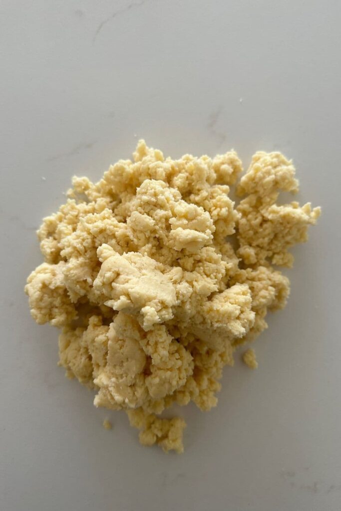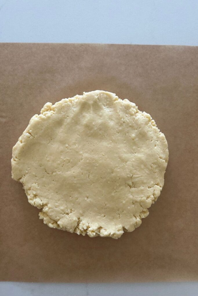 - Tip the dough out onto the counter and bring together into a disc. Flatten it out on some parchment paper and wrap it up and place in the fridge for at least 2 hours (you can leave it there for up to 48 hours if you like).This dough shouldn't be sticky, it should hold together without sticking to your hands.