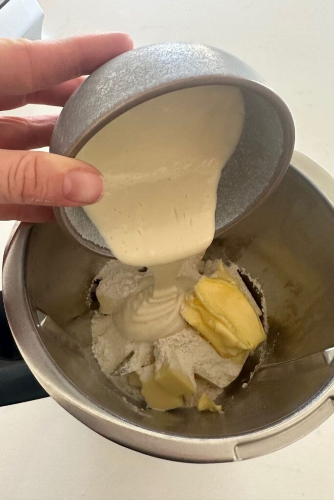 - Add all of the ingredients to the bowl of a food processor and blitz until it forms a dough. You can add a splash of iced water if it's not forming a dough, but it should be wet enough without the water due to the sourdough starter.