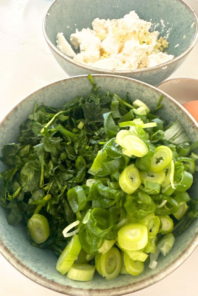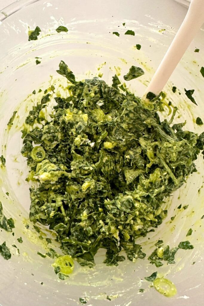 - Roughly chop the baby spinach, finely dice the garlic clove, crumble up the feta and lightly beat the egg. Add all of the filling ingredients to a mixing bowl and stir until well combined and the spinach is wilted down. Set aside (put it in the fridge if you are not going to use it just yet).