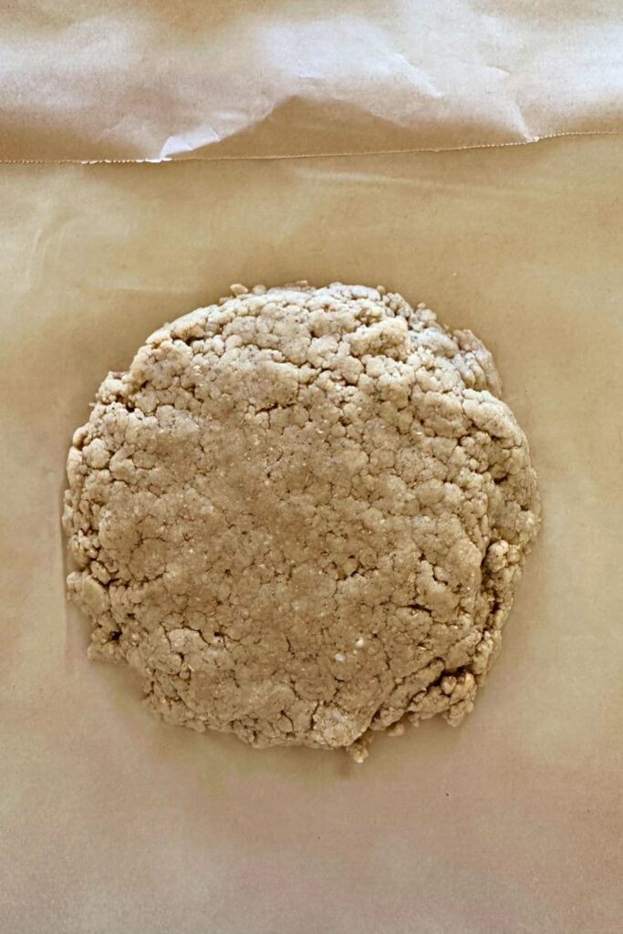Once you've mixed the dough (no matter whether you've used a food processor or mixed it by hand), tip it out onto the counter and push it together to form a dough. The dough should stick together when you push on it. Divide the dough into two portions, flatten into disks, wrap in parchment paper and place into the fridge to ferment.