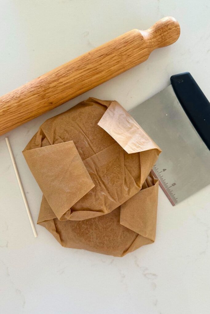 - Once you've mixed the dough, tip it out onto the counter and push it together to form a dough. The dough should stick together when you push on it. Divide the dough into two portions, flatten into disks, wrap in parchment paper and place into the fridge to ferment.You can leave the dough in the fridge for a minimum of 2 hours for up to 48 hours.