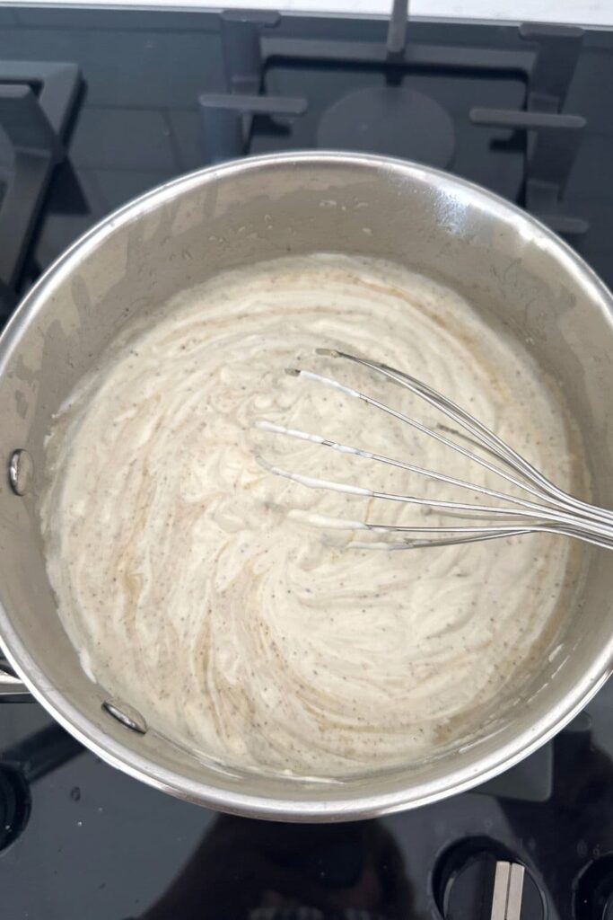 - In a medium sized saucepan, melt the butter gently. Once the butter is melted, add the sourdough starter and whisk until combined. Then add the milk on top and whisk over a medium heat until the sauce thickens. Add the pepper, salt and onion powder and whisk until well combined. Depending on which type of pepper you use, the sauce might look a grey or brown color - don't stress, it will be fine!