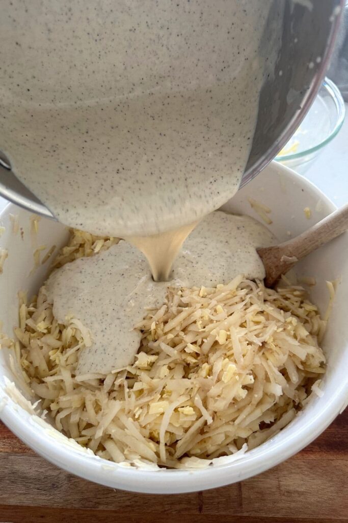 - In a large bowl, add the potatoes and about ¾ of the cheese and stir together until well distributed. Now pour the white sauce into the bowl and stir through the potato and cheese mixture.