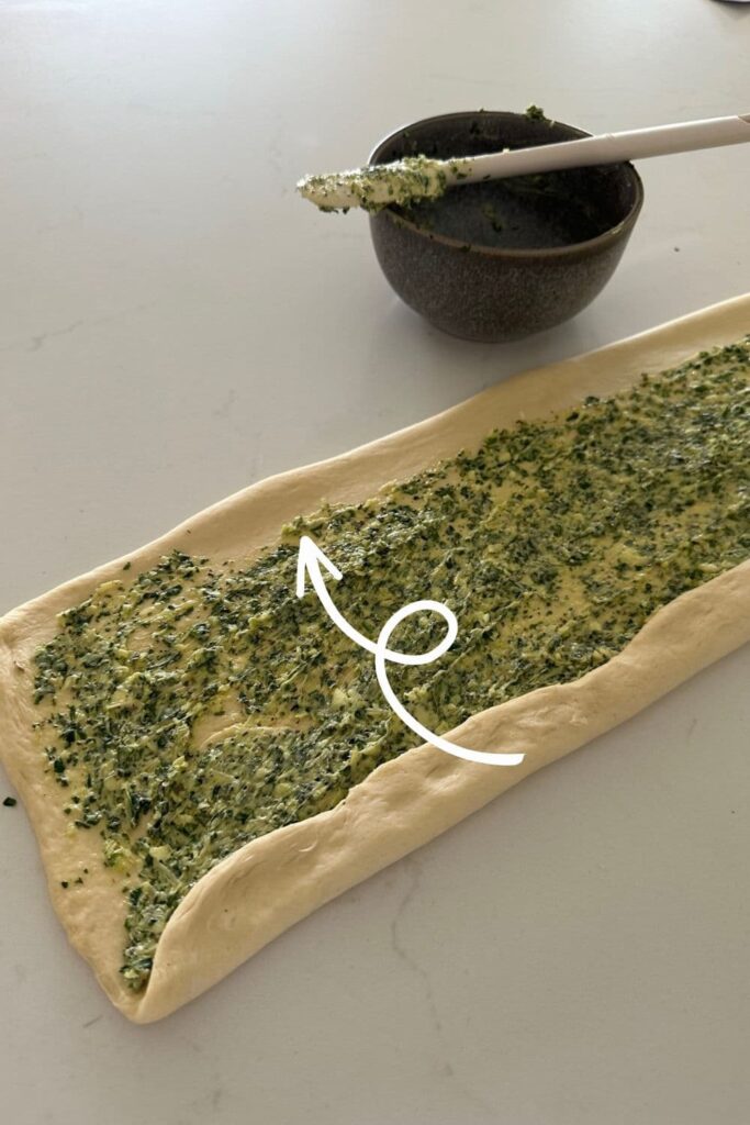- Now spread the herb and garlic filling all over the dough, leaving a 1" strip at the top with no filling.