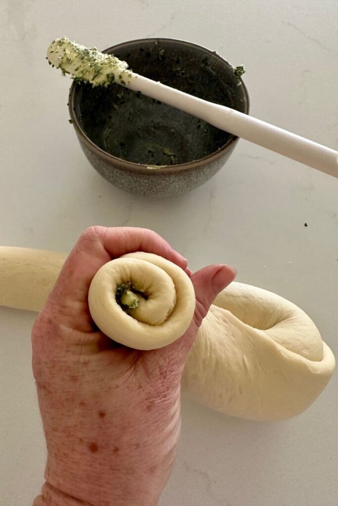 - Using a sharp knife or dough scraper, cut the log through the middle all the way up, leaving just a small part of the dough attached so you have two strands. You will be able to see the swirls of garlic and herb butter where you have sliced it (refer to step by step photos in the blog above for visual aids on how to do this).