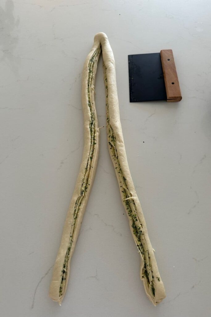 - Using a knife or dough scraper, cut the log through the middle all the way up, leaving just a small part of the dough attached so you have two strands. You will be able to see the swirls of garlic and herb butter where you have sliced it (refer to step by step photos in the blog above for visual aids on how to do this).