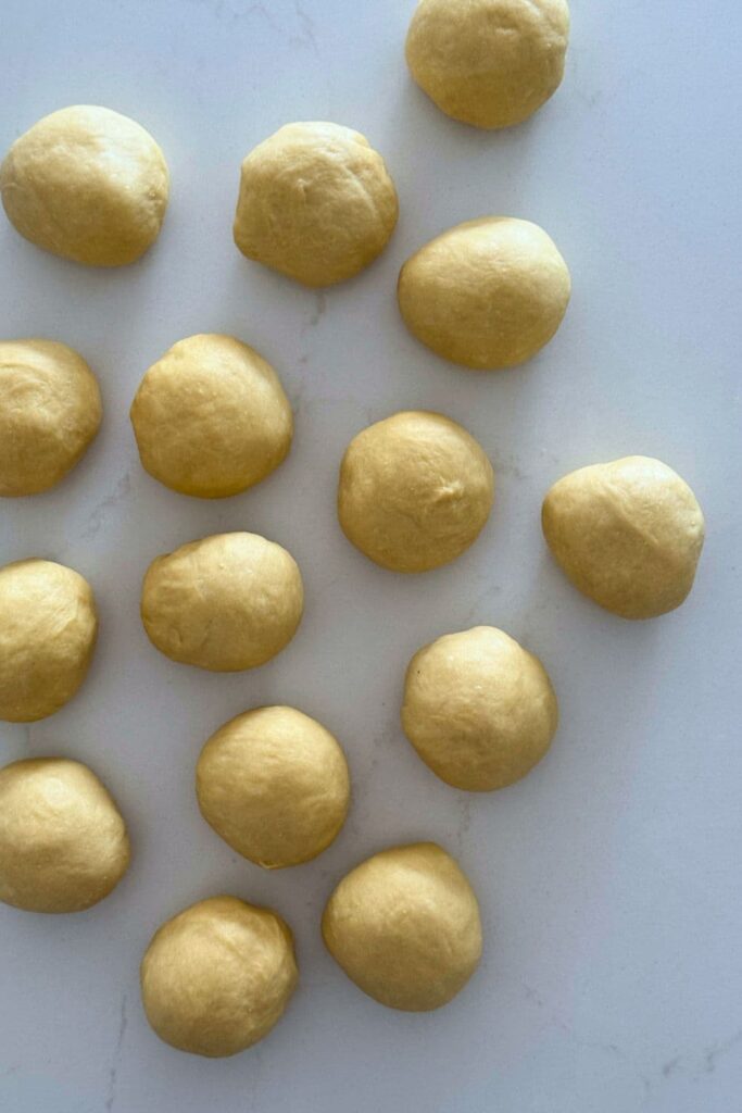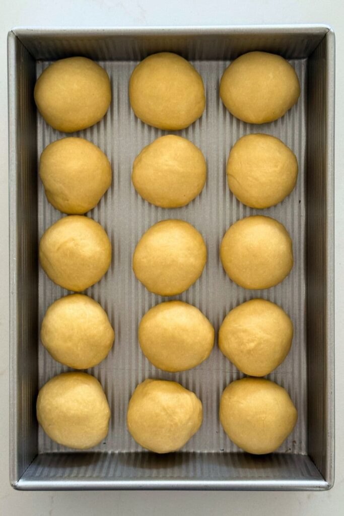 When the dough has doubled, divide it into individual rolls (about 15 rolls at roughly 80g each, or adjust to your preferred size) and gently shape them into smooth balls.