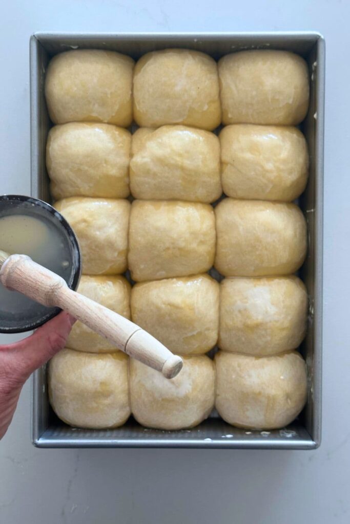 When you’re ready to bake, preheat your oven to 190°C (375°F). Brush the tops of the rolls with a little heavy cream, then bake for 25–30 minutes until golden brown. While they bake, mix melted butter and honey to create a warm honey-butter glaze. Once the rolls come out of the oven, brush them generously with the glaze and let them cool just slightly before serving.