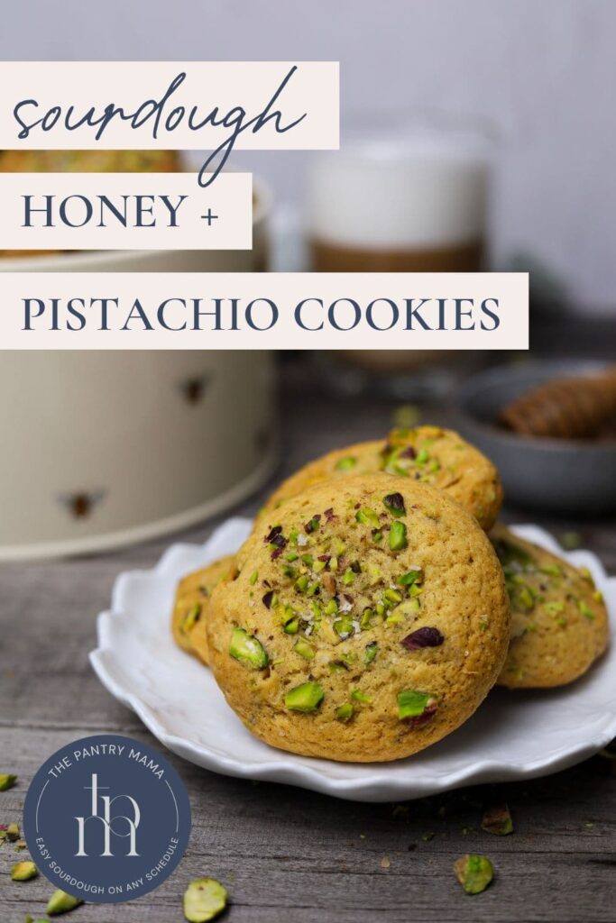 These sourdough honey pistachio cookies provide something a little different! Sweet and fragrant notes from the honey, alongside colorful, crunchy pistachios sprinkled with a splash of flakey sea salt for a surprising finish! These sourdough honey pistachio cookies are going to be a family favorite at your house, just like they are in mine!