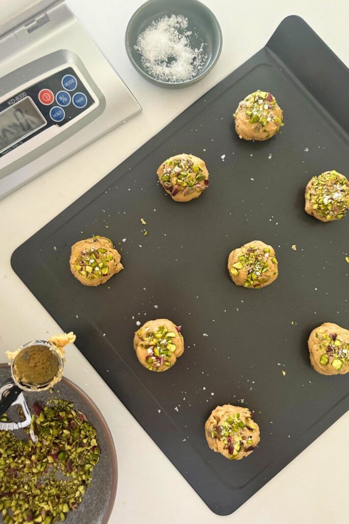 - Use a cookie scoop or large spoon to scoop out balls of dough. I have used 35g dough balls for this recipe. Roll each dough ball in some roughly chopped pistachios before placing the dough balls onto the prepared baking sheets. Sprinkle with some flakey sea salt.