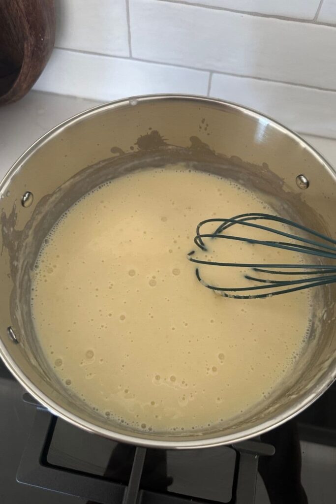 Continue whisking over a medium heat as you add more of the milk, a little at a time, until all of the milk has been added. Continue whisking for around 5 minutes and you'll see the white sauce begin the thicken.