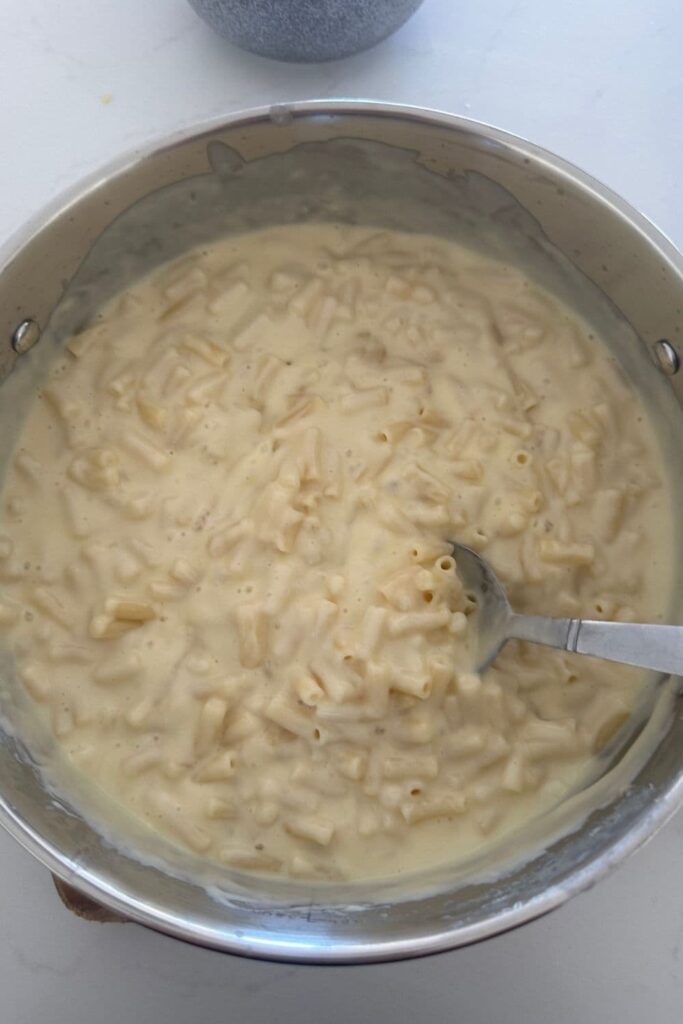 Add the pasta on top of the cheese sauce and stir to coat all of the macaroni.
