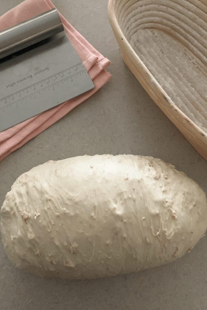 Shaping sourdough without flour minimises mess but also allows you to get a much tighter shape, increasing oven spring. Save the rice flour for the banneton rather than the kitchen counter.