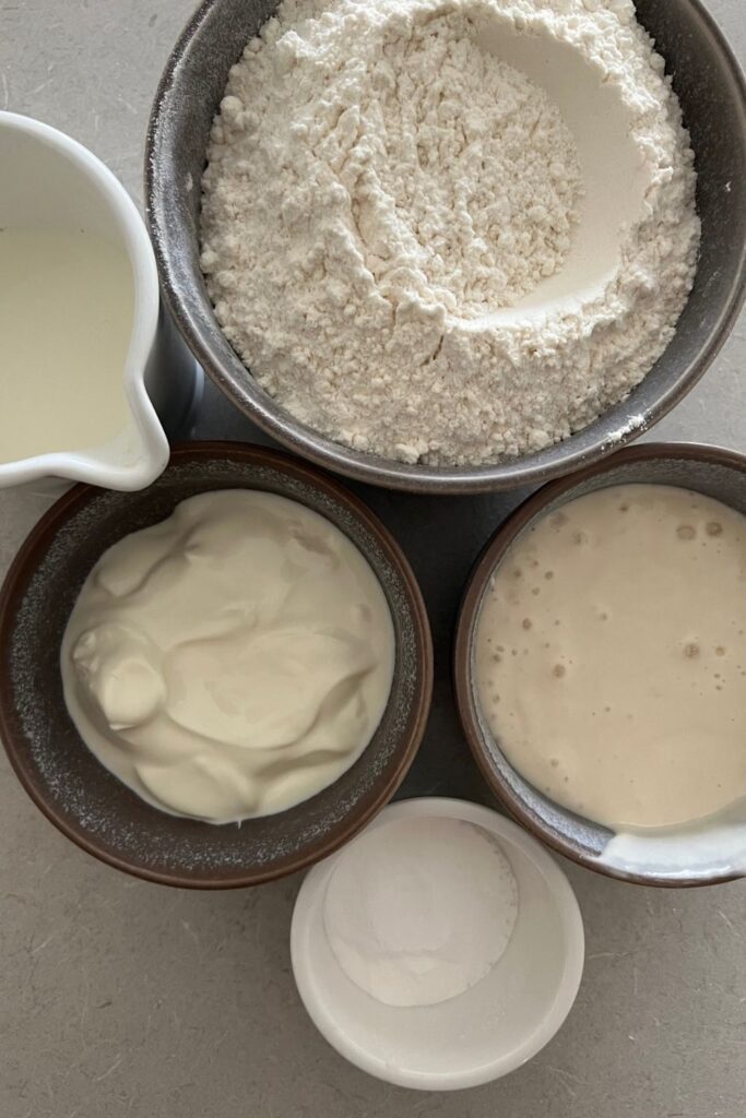 - Add whole milk, yogurt, olive oil and sourdough starter to a bowl and gently whisk to combine.