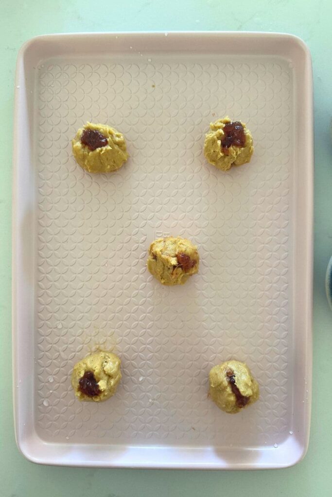 - Use a cookie scoop to make balls of the cookie dough (mine are 35g each). Roll each ball in your hands and then flatten out into a round. Add a small scoop of peanut butter and jelly to the centre of each ball and then gently pull up the edges. You don't have to close the balls, a little bit of the peanut butter and jelly should be poking out the top. They definitely don't have to be perfect!