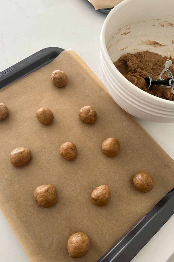 - Using a cookie scoop, form balls of dough and gently roll them in your hands before placing on the cookie trays. Allow around 2 inches between each cookie ball as they do spread a little.