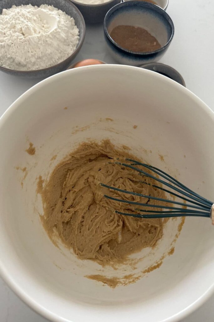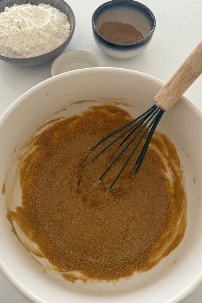 In a medium sized mixing bowl, add the butter and brown sugar and whisk until well combined.