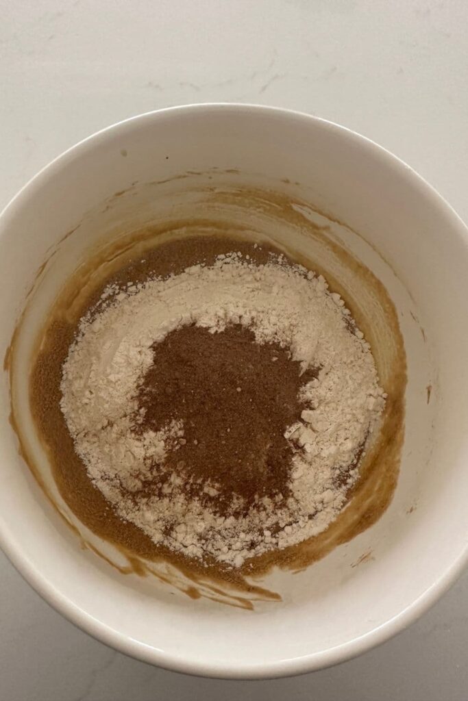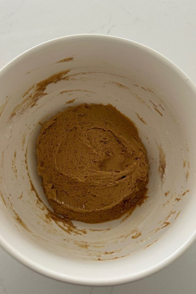 To this bowl, add the flour and spices you combined earlier and mix with a spatula to form the cookie dough.