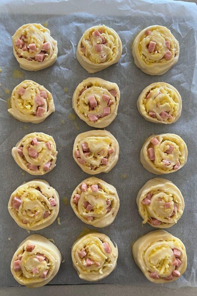 - Once the dough has finished rising, you will need to fill and shape ham and cheese pinwheels.