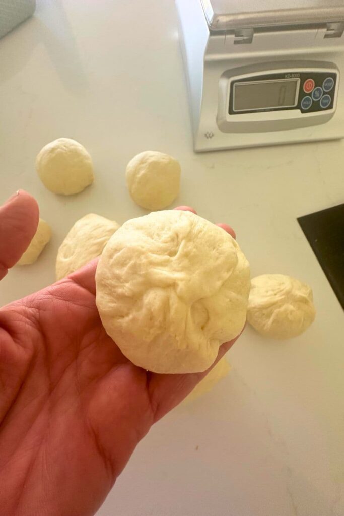 Once the dough is ready, separate the dough into smaller balls so they are ready to be rolled out. I find around 80g to be the perfect size. The easiest way to do this is to flip the dough onto your counter, making sure the sticky side is facing up.