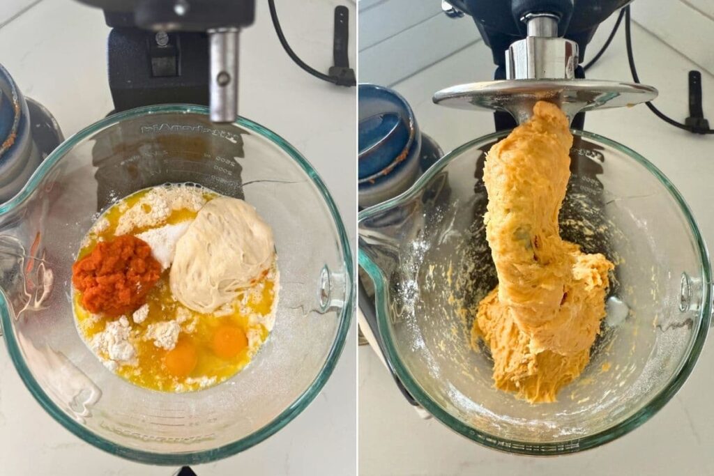 - Mixing & Kneading the DoughAdd the warm milk, sugar, pumpkin puree, sourdough starter, egg, vanilla, salt, bread flour and softened butter to the bowl of a stand mixer and knead to a rough dough using the dough hook attachment on low speed. Leave the dough to rest for around 30 minutes.