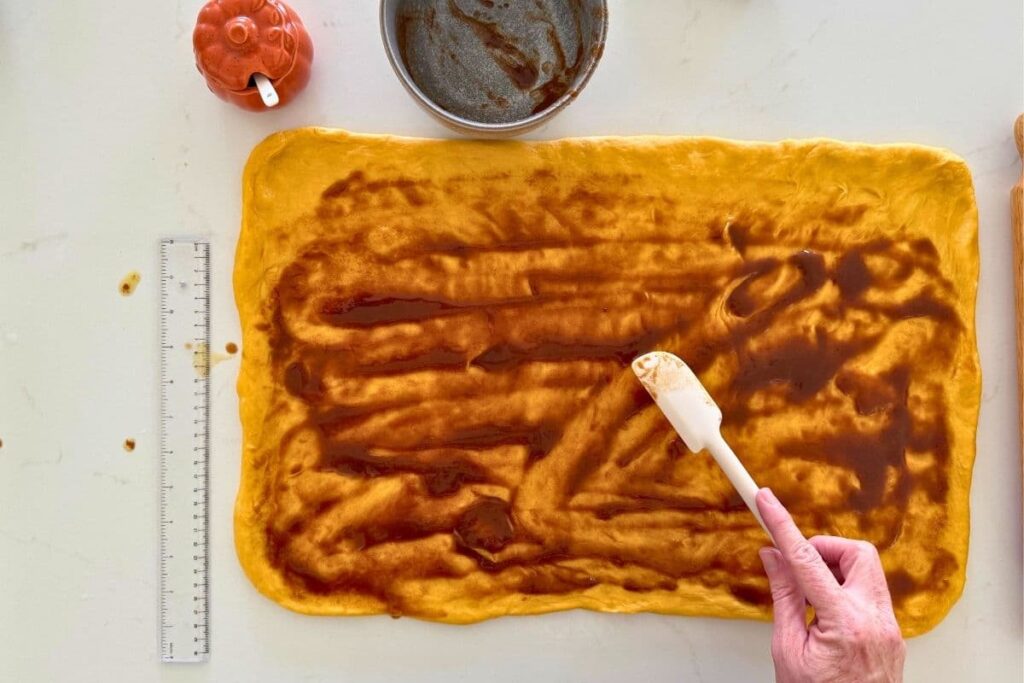 Once the dough has finished bulk fermentation, you will need to fill and shape the sourdough pumpkin cinnamon rolls.