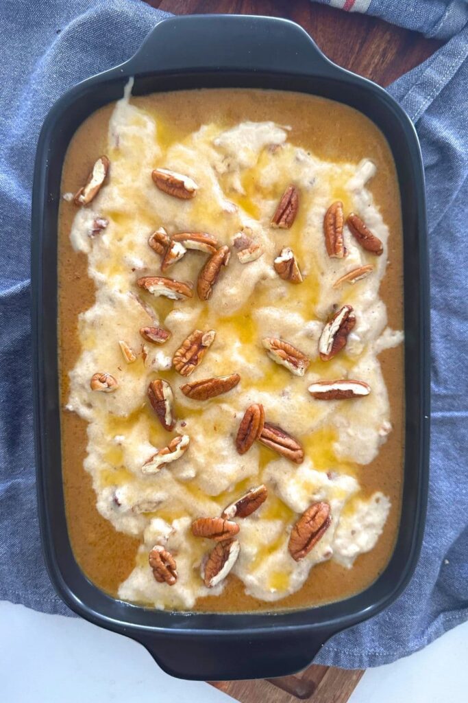 - Sprinkle the batter with melted butter, granulated sugar and some chopped pecans (if desired).