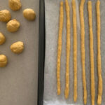 - Roll each ball of dough into a long, thin bread stick and place on the lined tray.