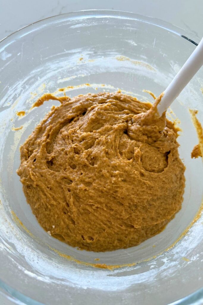 - In a separate bowl mix together the dry ingredients (all purpose flour, salt, baking powder, pumpkin spice, brown sugar and granulated sugar.