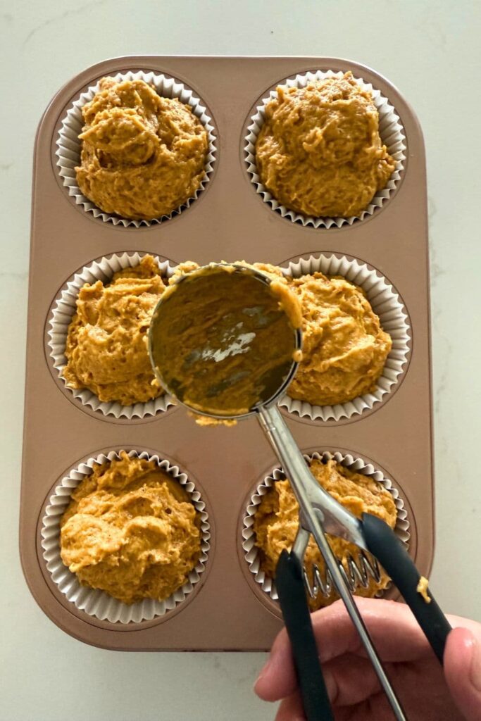 - Use a 3 tablespoon cookie scoop to evenly divide the muffin batter among the 6 muffin holes. To get a lovely dome on top, fill the liners all the way to the top.