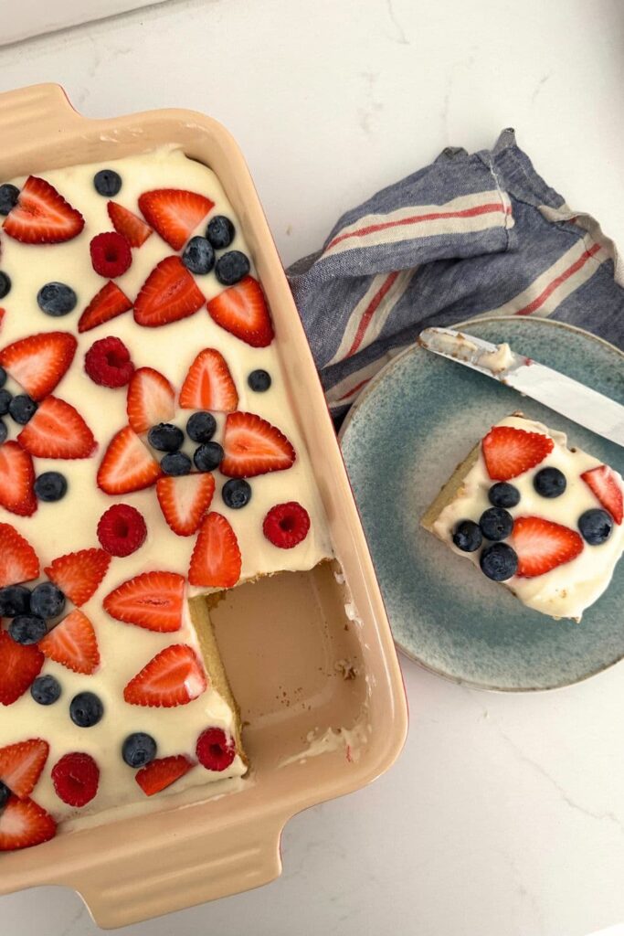 This sourdough vanilla sheet cake topped with red, white and blue decorations is the perfect way to celebrate 4th July! It's so easy to create this red, white and blue effect using summer berries!