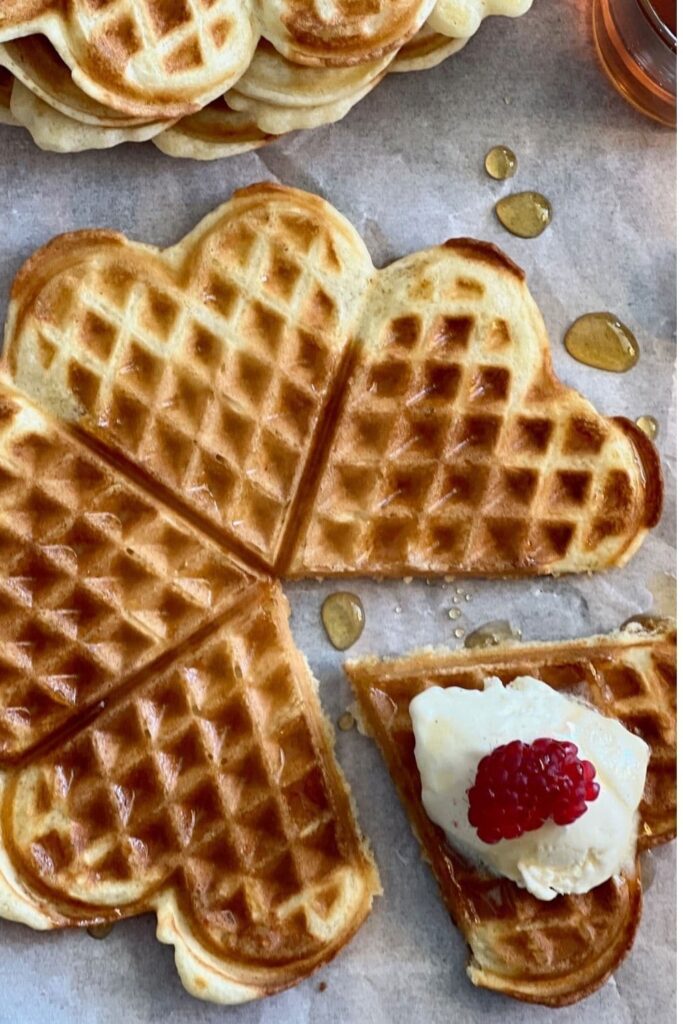 Sourdough waffles use up a big 200g of sourdough starter and 2 eggs - and if you are feeding more than couple of people, you'll need to make a double or even triple batch with means even more eggs and starter!