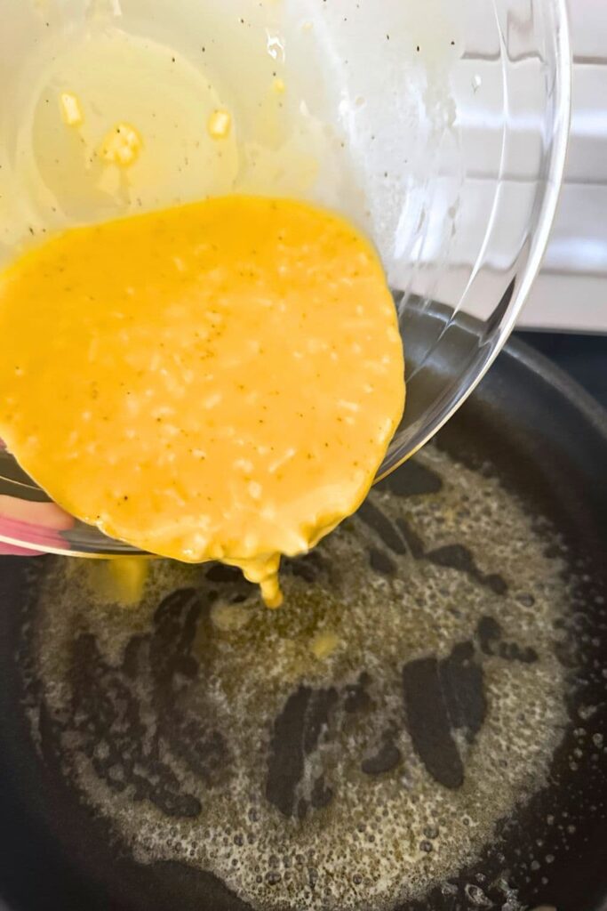 - Heat a frying pan or cast iron skillet over a medium heat and add the butter. Allow the butter to melt and then pour the sourdough egg mixture into the pan.