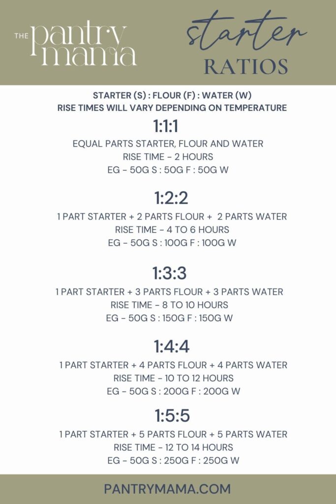 I've created this useful graphic to help you understand the different ratios and their approximate rising times. Remember though, that rise times really are only an approximation and you can never truly be exact because it depends on the temperature of your kitchen, the temperature of the water and flour you add, the point at which the sourdough starter you're using was last fed. There are so many variables that make up this equation.