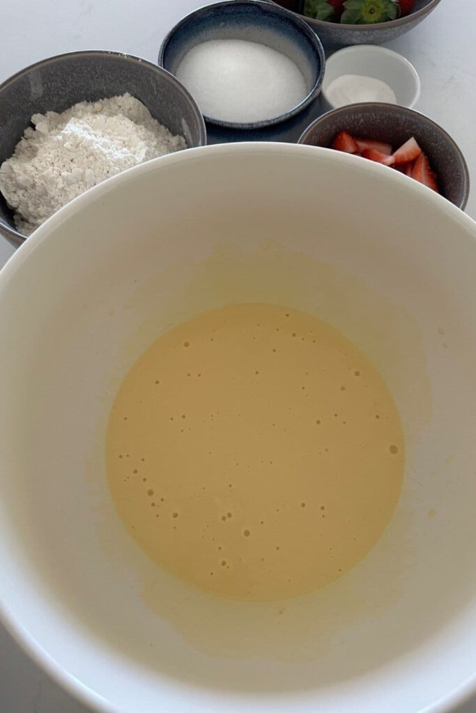- Prepare the strawberries before you begin the cake batter. Hull all the strawberries, wash and dry. Take 100g of hulled strawberries and slice them once lengthways and then into small slices. Set these aside for the cake batter.