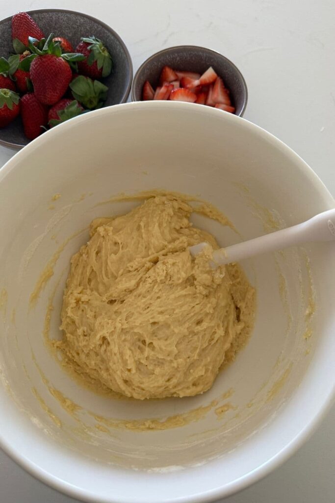 Bake for 50 minutes at 180C (350F) or until a toothpick comes out clean. The cake should be golden brown and the strawberries will be juicy, but still holding their shape.