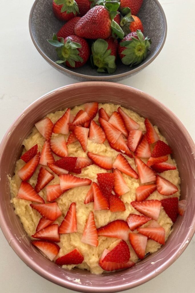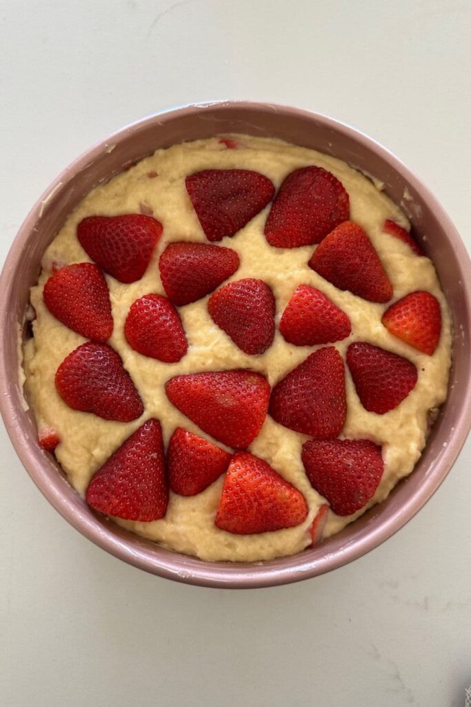 - Take the 400g of strawberries you sliced in half and arrange these, cut side down on the top of the cake batter.