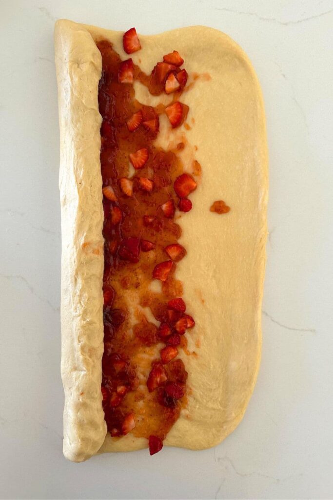 Before you roll out the dough you need to make the filling. Add the diced strawberries to the strawberry jam and mix until well combined. Set aside while you roll out the dough. For a little extra zing, consider adding a little lemon juice or even lemon zest to the filing mixture.