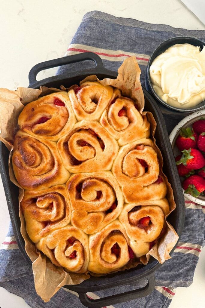 - Place the sourdough strawberry rolls into a cast iron skillet lined with baking paper. Face all the seams inwards so that they don't unravel. If you don't have a cast iron skillet, a baking tray or casserole dish is perfectly fine. They don't have to touch as they will once the dough is puffy.