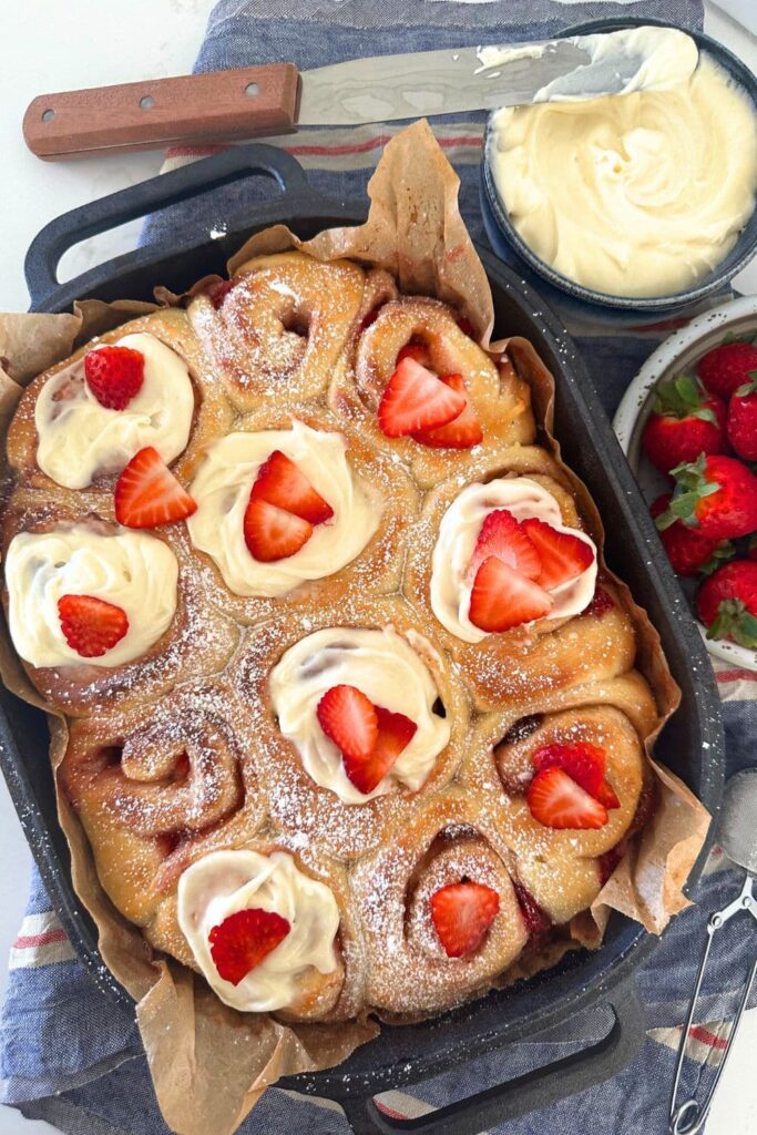 Top the frosted rolls with fresh, sweet strawberries for a pop of fresh color and sweetness.