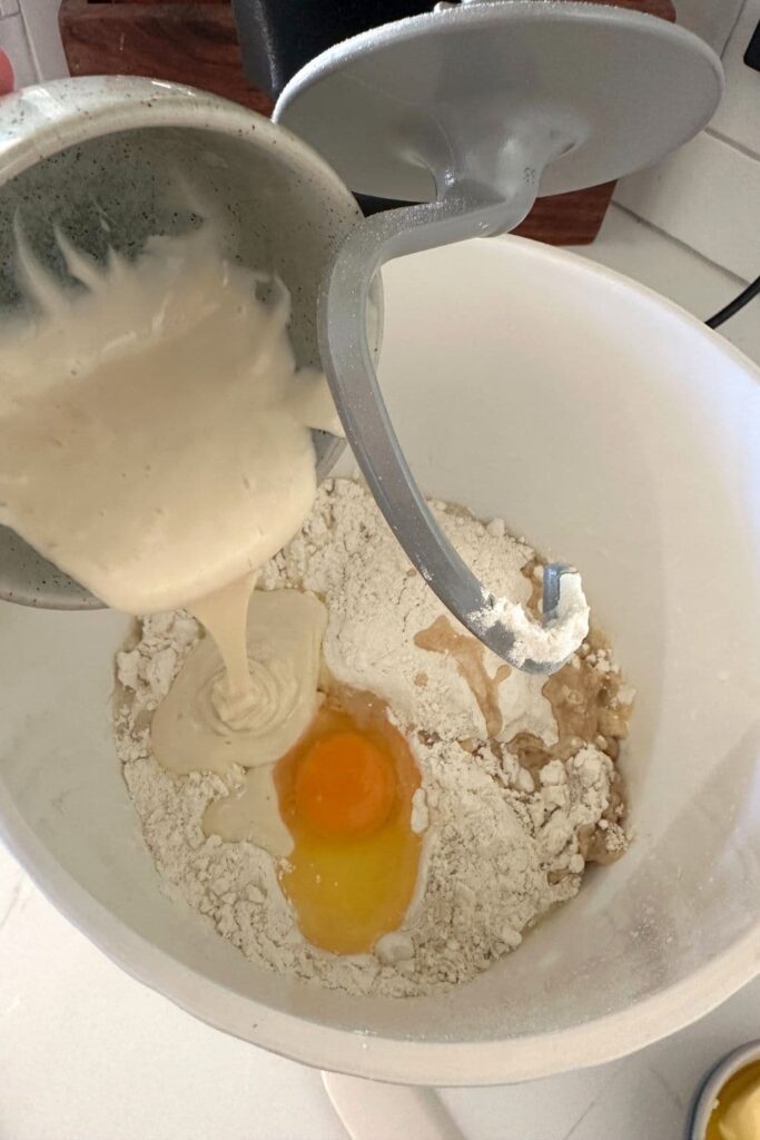 Now add your sourdough starter, egg, vanilla extract, salt and bread flour and use your stand mixer to knead into a rough dough (I swap over to the dough hook attachment for this step).