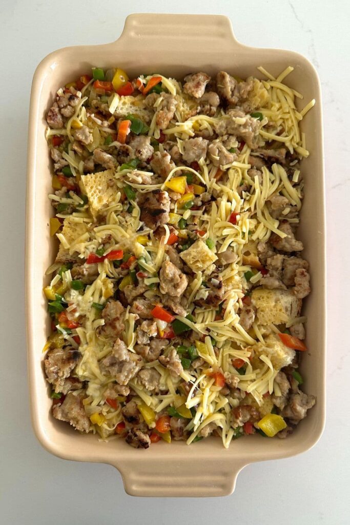 A hearty, make-ahead breakfast casserole featuring sourdough bread, eggs, vegetables, and sausage. It feeds a crowd, holds them over until the big meal, and brings big flavor with little effort. This is the kind of breakfast you want when you have overnight guests.