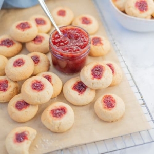 The dough is rolled into small balls (a 1 tablespoon cookie scoop is perfect), indented with a small spoon, and filled with a touch of jam, with the option to chill the formed cookies for up to 24 hours for a long-fermented version. Baked in a moderate oven until golden and gently bubbling, these cookies finish with a short rest on the tray before cooling completely on a cooling rack, giving you perfectly tender, fruity bites every time.