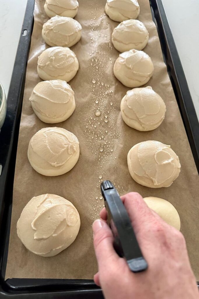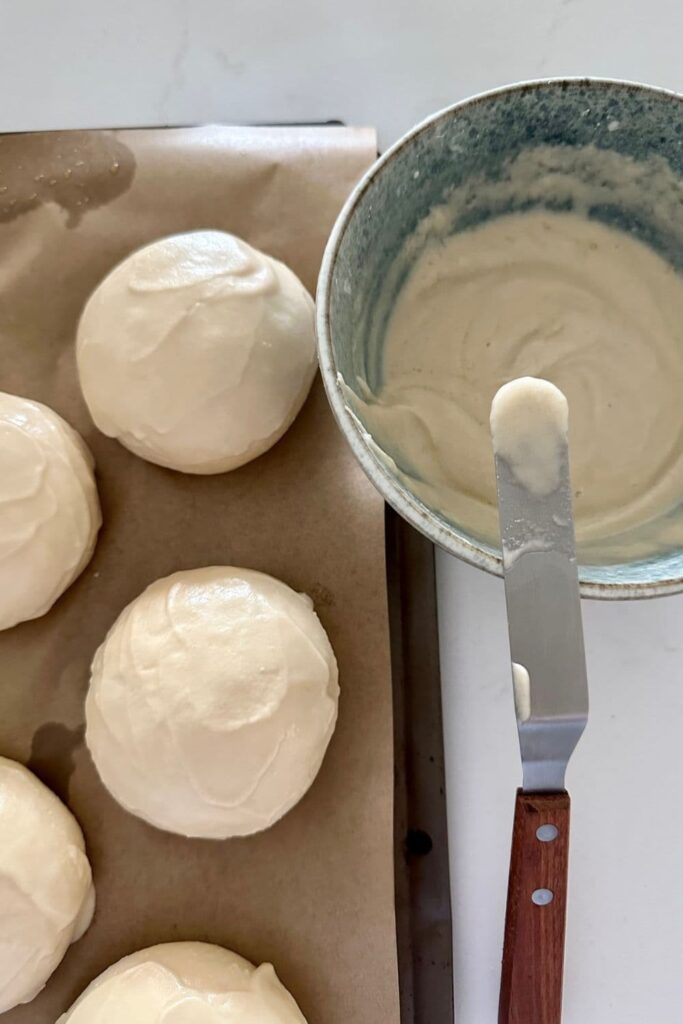 - Paint the top of the bread with some of the rice flour paste you made earlier. An offset spatula is perfect for this task. You want the bread rolls generously coated, but not dripping. Be really carefully not to squash the rolls as you don't want them to lose their beautiful round shape.
