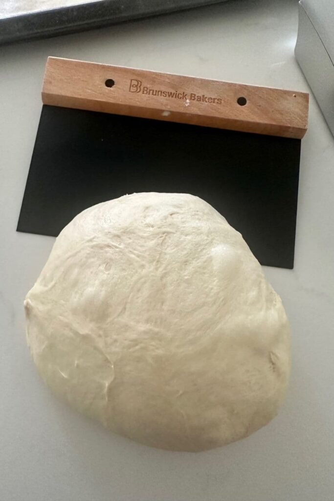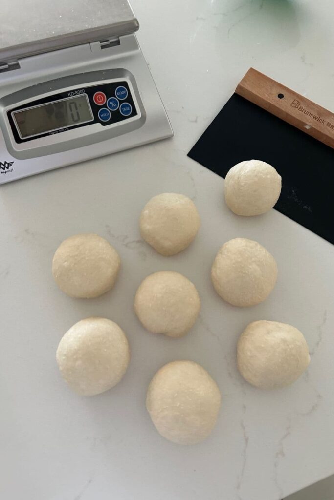 - Once the dough has risen a little, turn it out onto the counter and divide it into 10 equal pieces (you can use a scale if you want them exactly equal). You might get more rolls depending on the size of the dough balls you make. I like around 75g but anywhere from 75 to 100g is nice.