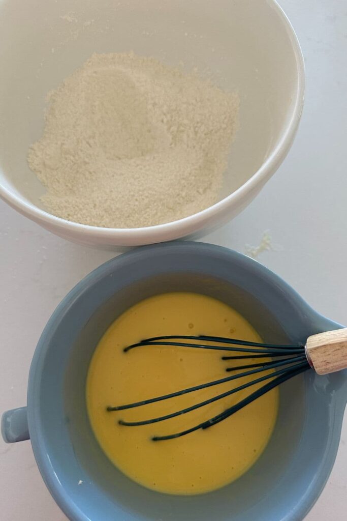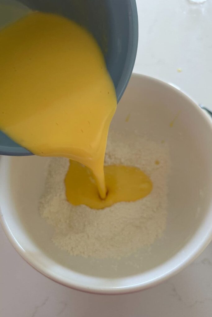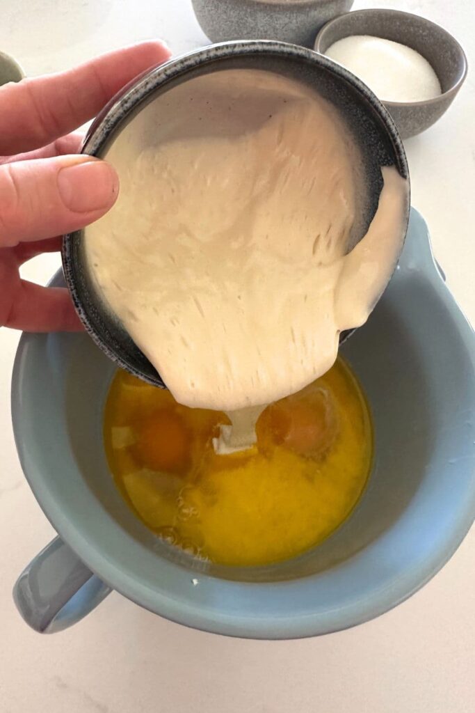 - In a small mixing bowl or batter jug, combine the melted butter, eggs, vanilla, milk and sourdough starter and whisk until well combined. Now set the wet ingredients aside.