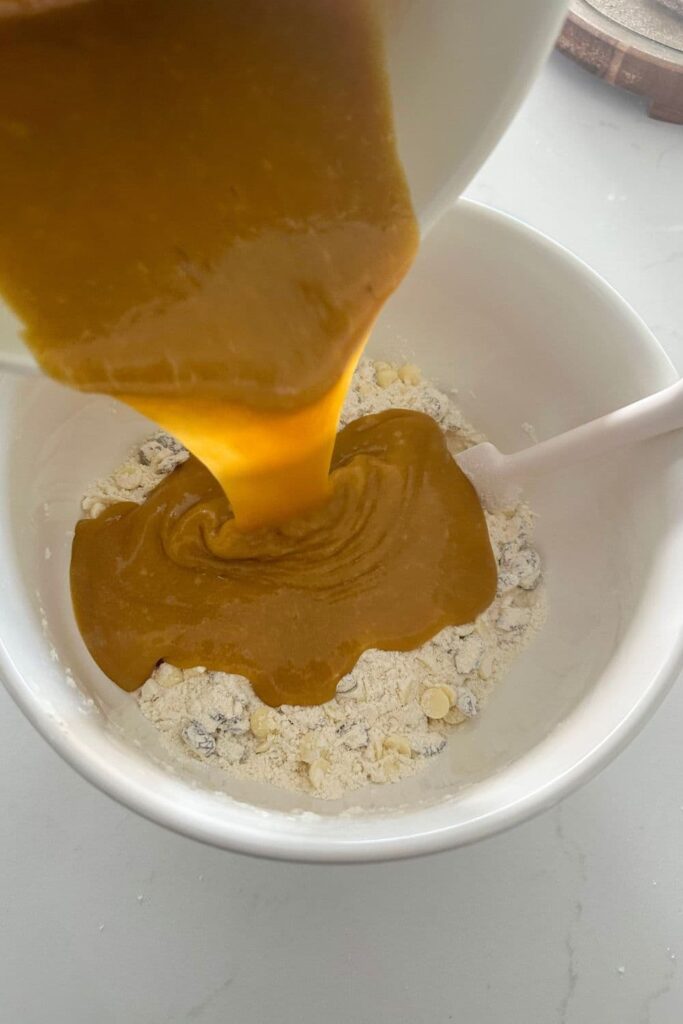 Now pour the wet ingredients into the dry ingredients and stir to form the cookie dough.