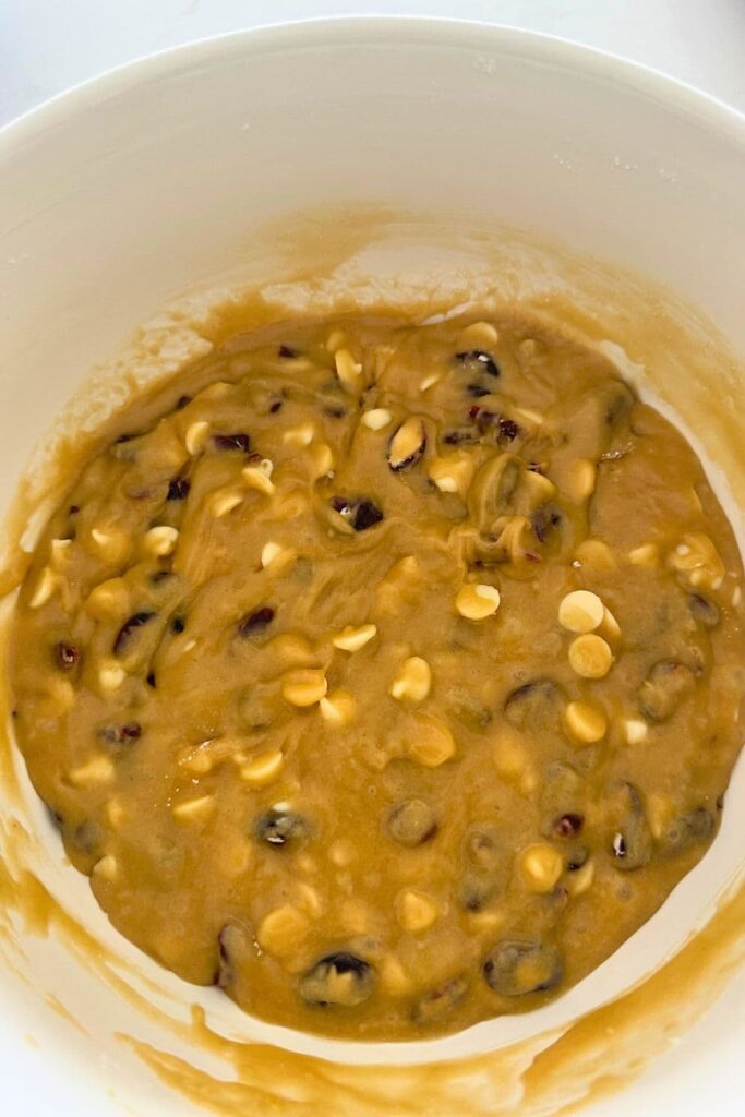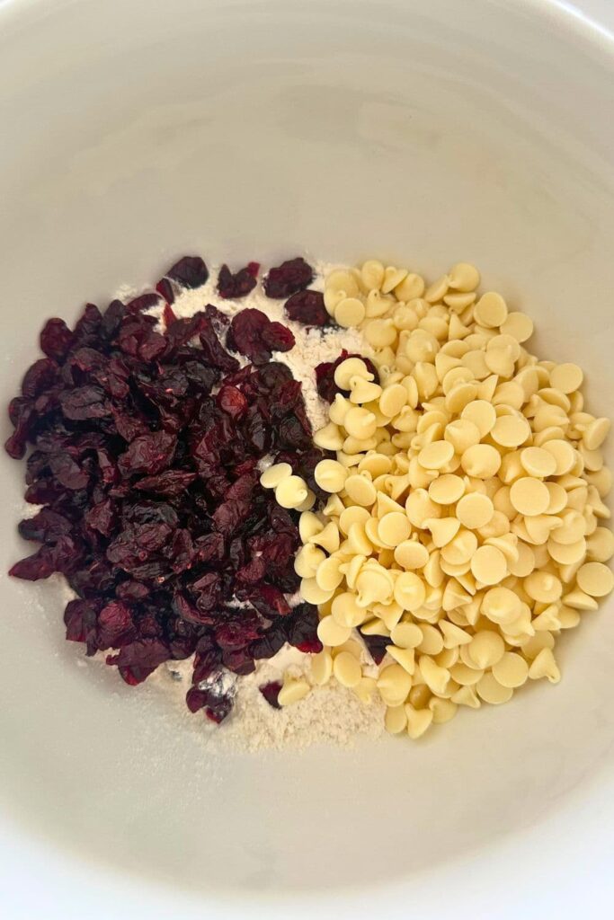 - Place the all purpose flour, baking soda, salt, white chocolate and cranberries into a large mixing bowl and combine. Set this aside.
